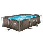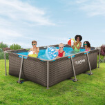 Pileta estructural de lona. Capacidad: 2555 lts. Medidas: 260x160x66 cm. Lona símil rattán , 3 capas de malla de poliester entre materiales de PVC de gran calibre. Marco de conector inteligente: función click-in para fácil ensamblaje. Práctico tapón de drenaje de liberación rápida con conexión para manguera de jardín.