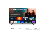Smart TV con sistema operativo Google TV. Pantalla: 58" 4k Ultra HD (3840 x 2160). Asistente de voz y Google integrados. Memoria Flash integrada: 16GB. 2 puertos USB. HDMI x 3. Conexión wifi y Ethernet LAN. Sonido Dolby Audio. Color y contraste HDR10. Control remoto con micrófono incorporado.