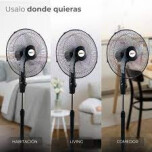 Ventilador de pie eléctrico/batería recargable. Diámetro: 16". Potencia: 15 watts. Autonomía de la batería: hasta 10hs (en velocidad mínima). 3 velocidades. Aspas de plástico reforzado. Cabezal oscilante 180º.