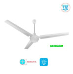 Ventilador de techo industrial. Potencia: 90 watts. Diámetro: 56" (1.40 mts). 5 velocidades. 3 palas metálicas de color blanco. Regulador de velocidad de pared. Velocidad máxima 320RPM. Luz led. Motor con doble rodamiento blindado.
