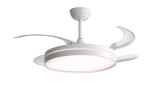 Ventilador de techo con palas retráctiles. Diámetro extendido: 1.06 m – cerrado: 0.5m (42”). 2 en 1: Ventilador y plafón de luz. 4 palas retráctiles transparentes. 6 velocidades. Motor silencioso. Luz LED de 3 intensidades: Fría, Cálida y Neutra. Control remoto. Timer programable. Incluye barral y soportes para su instalación. Velocidad máxima: 285 RPM. Motor DC. Potencia motor: 30 watts. Potencia luz led: 80 watts.